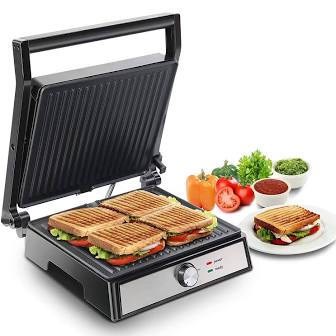 11] Panini Grill : A bread sandwich maker of the the older times was a diagonal shaped device with a long handle. You load it with two slices of bread with some filling snapped in between and show it over the gas flame to make a grilled sandwich. The modern day electric avatar is the Panini grill. This one works on electricity, has capacity for at least two sandwiches and can also double up as grill for vegetables. And you get nice grill marks on the sandwich and vegetables, which makes guests go wow!